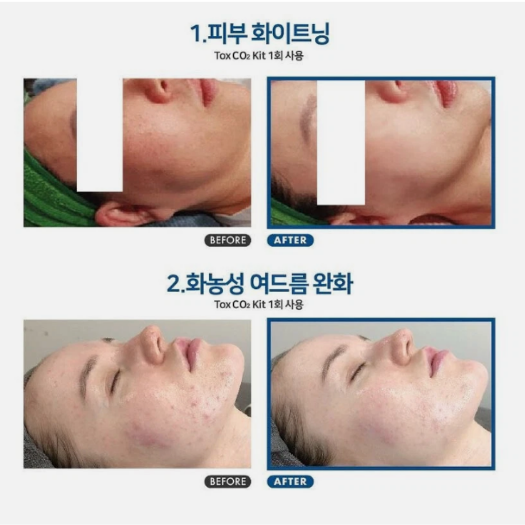 The Celldich TOX CO₂ Kit is a professional-grade oxygen therapy system inspired by premium Korean dermatology clinics — redesigned for safe, powerful results at home. Using a controlled CO₂ infusion, the treatment triggers the Bohr Effect, instantly increasing oxygen delivery to the skin to clear acne, refine texture, boost radiance, and lift facial contours in minutes. The CO₂ gel and activating sheet work together to exfoliate gently, unclog pores, and disrupt anaerobic acne-causing bacteria without irritation, making it suitable even for sensitive or breakout-prone skin. Each session brightens dullness, tightens pores, and energizes skin metabolism for a visibly smoother, firmer, more even complexion. Expect a transformative glow and clinic-level results with every use — all from the comfort of home.